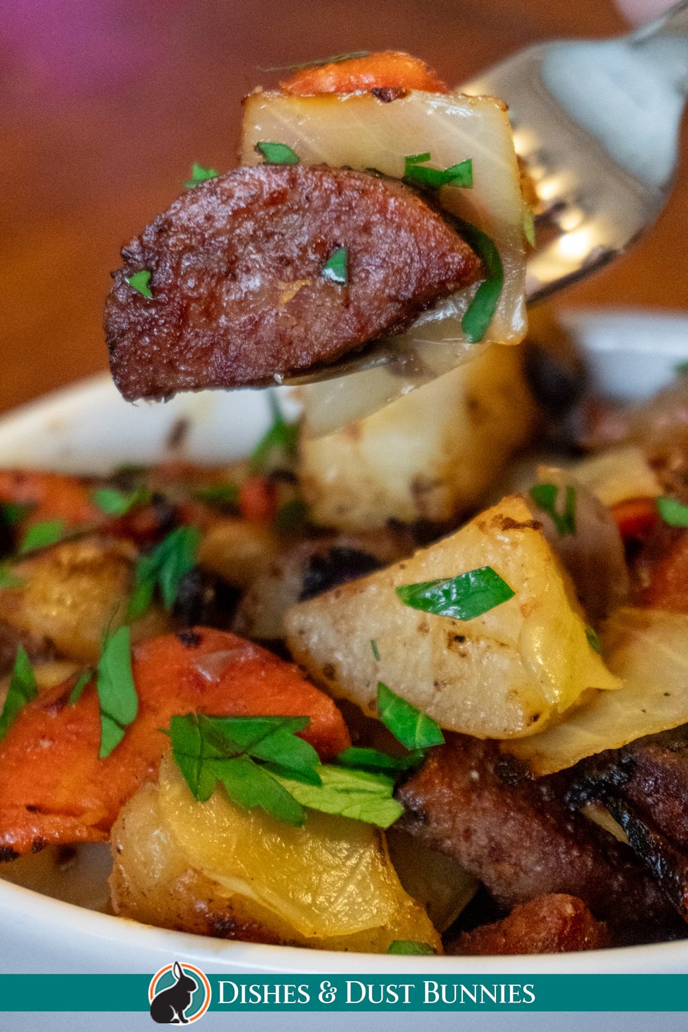 The sausage is cooked first to develop flavor and get some nice browning. Potatoes, carrots, and onion are added next and cooked until they begin to soften. Seasonings and chopped cabbage are stirred in, and the pan is briefly covered to allow the vegetables to steam and become tender.